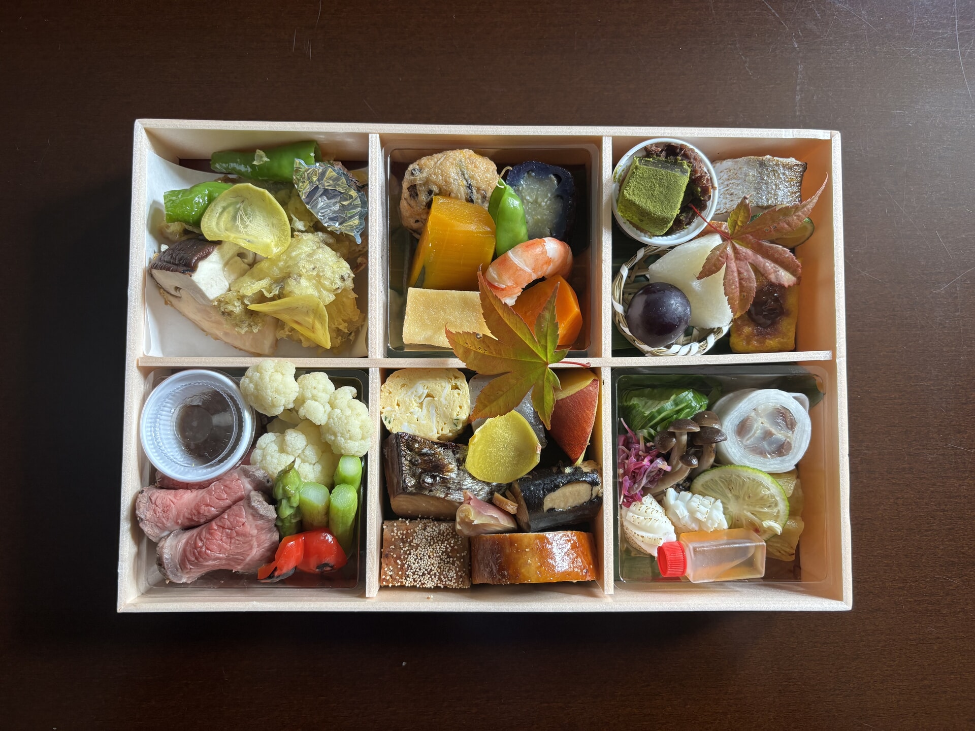 鰆西京焼き、鶏八幡巻き、出汁巻き玉子、鶏松風焼き、海老真薯揚げ牛しぐれ煮、南京、里芋、蕪、コンニャク、丸十レモン煮けんちん揚げ、海老芝煮、パプリカ南蛮漬け、蛇腹胡瓜梅肉和え、いんげん胡麻和え